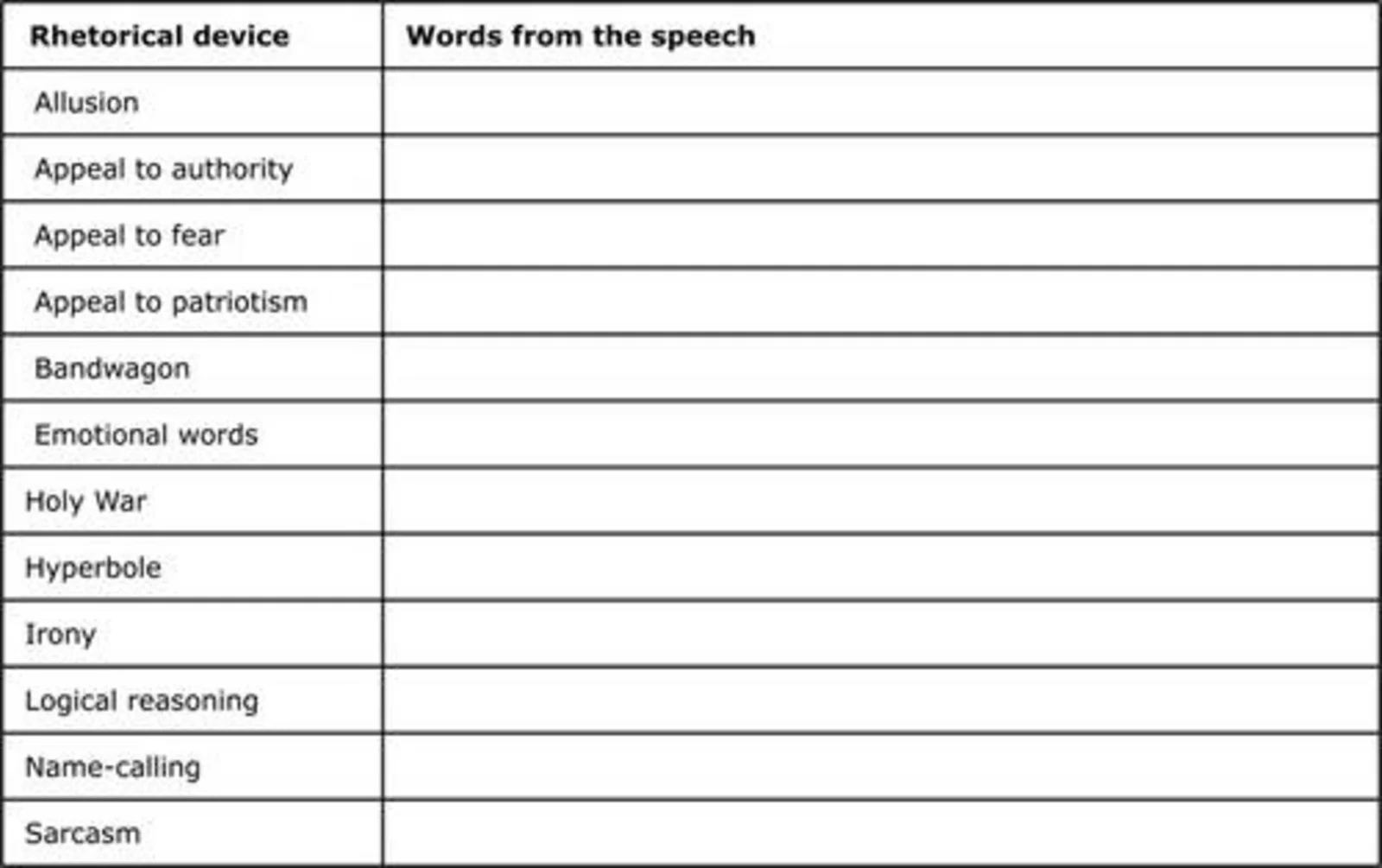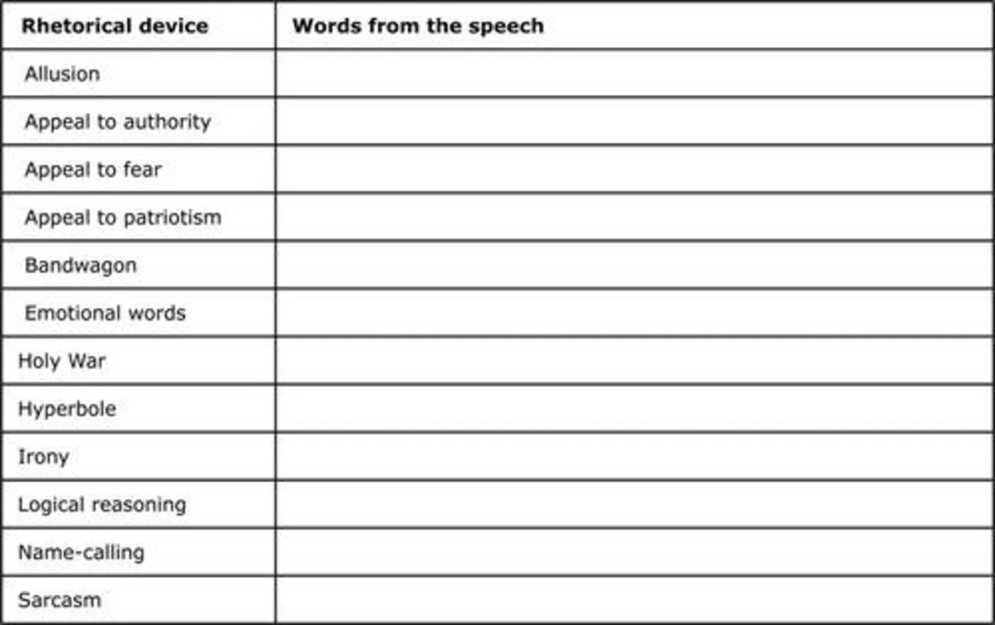 1. Find examples from the speech to fit the following rhetorical devices.