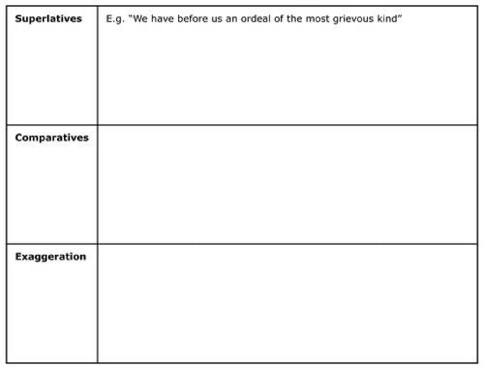 The language is full of intensifiers, including superlatives (greatest, best, most, fastest), comparatives, and exaggeration. The superlatives decide the tone of the speech, making Churchill appear bolder, and the situation more serious.