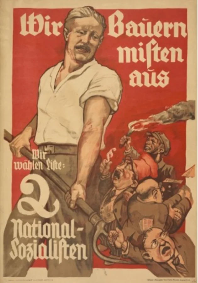 Valgplakaten er fra rigsdagsvalget i 1932 og er udarbejdet af den tyske kunstner Felix Albrect. Plakaten viser en landmand med nazistisk bæltespænde. Han står med en høtyv der fjerner 'lort', dvs. politikere (med deres love §) og folk fra forretningsverdenen. Den unge mand med en flammekaster er en karikatur af en kommunist og manden med briller er en skildring af den karikerede, tyske jøde.