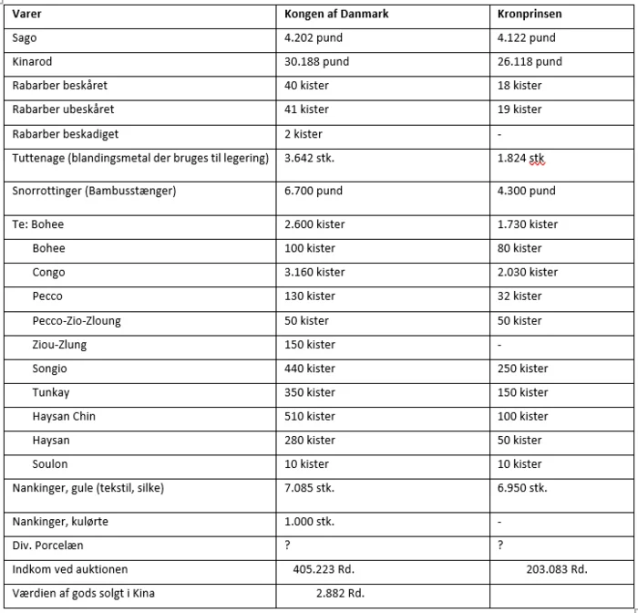 Kildeintroduktion: Tabellen er en oversigt over returladningerne i 1775 fra skibene ”Kongen af Danmark” og ”Kronprinsen” fra Kina.