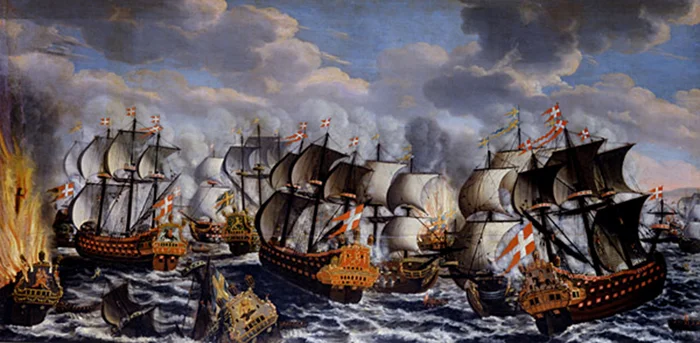 Kildeintroduktion: I 1677 kom det til et søslag mellem Danmark og Sverige ud for Køge Bugt. Slaget var en del af den skånske krig 1675-1679. Danmark kom bedst ud af slaget. Det er en begivenhed, som er blevet skildret mange gange og i mange forskellige sammenhænge. Også blandt kunstmalere. Her er først et billede af Carl Neumann, som er malet ca. 200 år efter slaget, og dernæst et billede af Claus Møinichen malet små 10 år efter slaget.