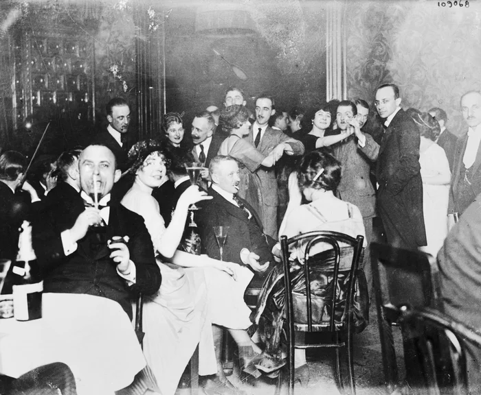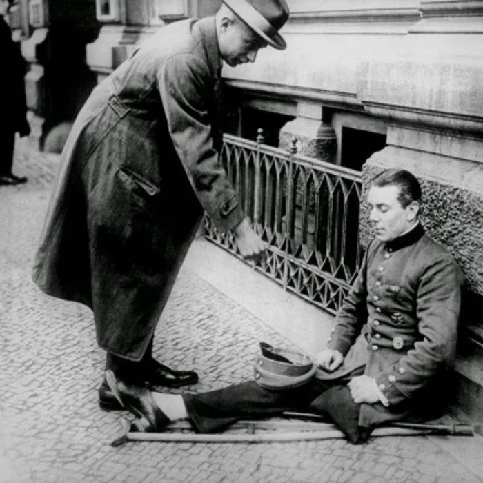 De to fotografier viser to sider af Weimarrepublikkens Berlin. På billedet til venstre ser vi en kø til en tiggende soldat fra 1. Verdenskrig. Billedet til højre (fra ca. 1923) viser en typisk scene fra en natklub i Berlin, hvor de, der havde tjent penge trods inflationen, festede.