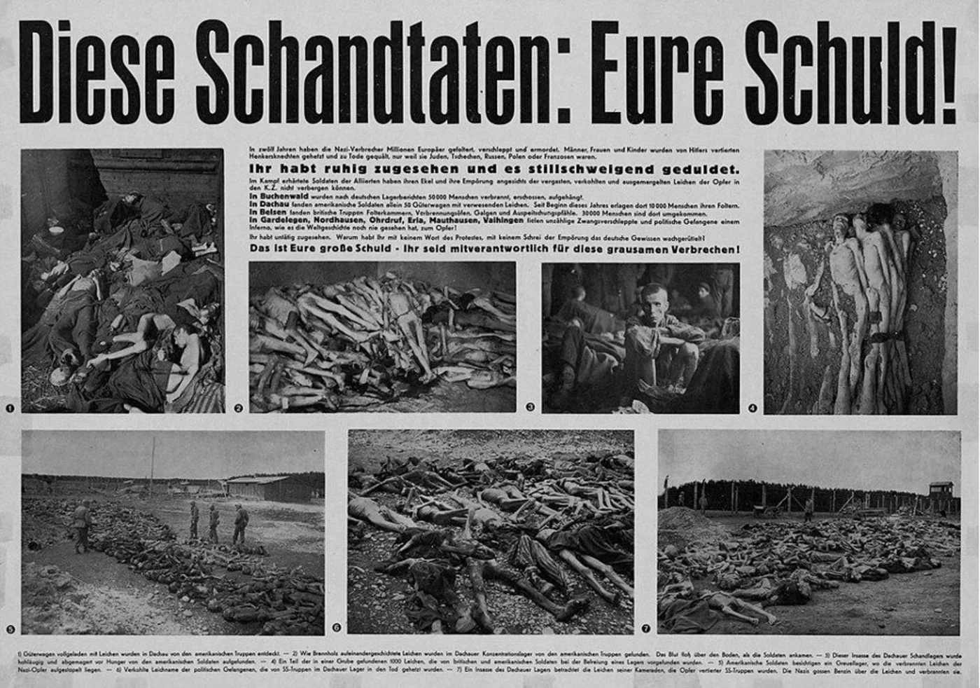 I den amerikanske besættelseszone blev flere civile tyskere pålagt ved selvsyn at besøge KZ-lejrene i deres nærhed. Der blev produceret dokumentarfilm om KZ-lejre med obligatorisk visning for flere grupper i biograferne. Understående plakat blev hængt op i den amerikanske besættelseszone i sommeren 1945 med overskriften ’Denne vanære – Din skyld’.