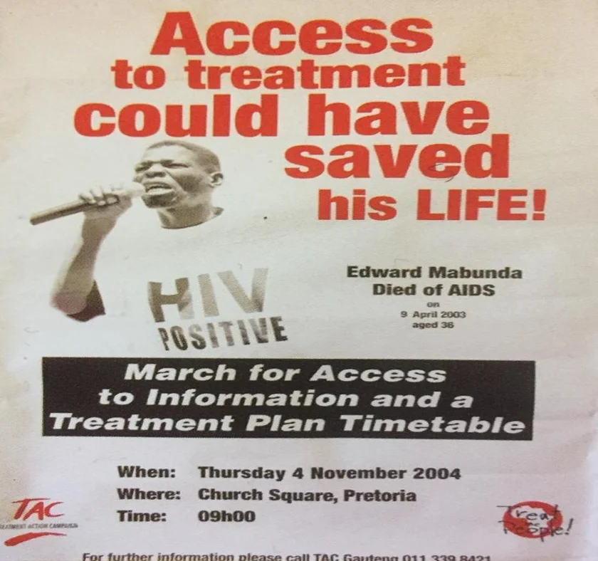 Plakaten er udarbejdet af den sydafrikanske græsrodsbevægelse TAC og er en invitation til en demonstration for adgang til den livsvigtige antivirale medicin.