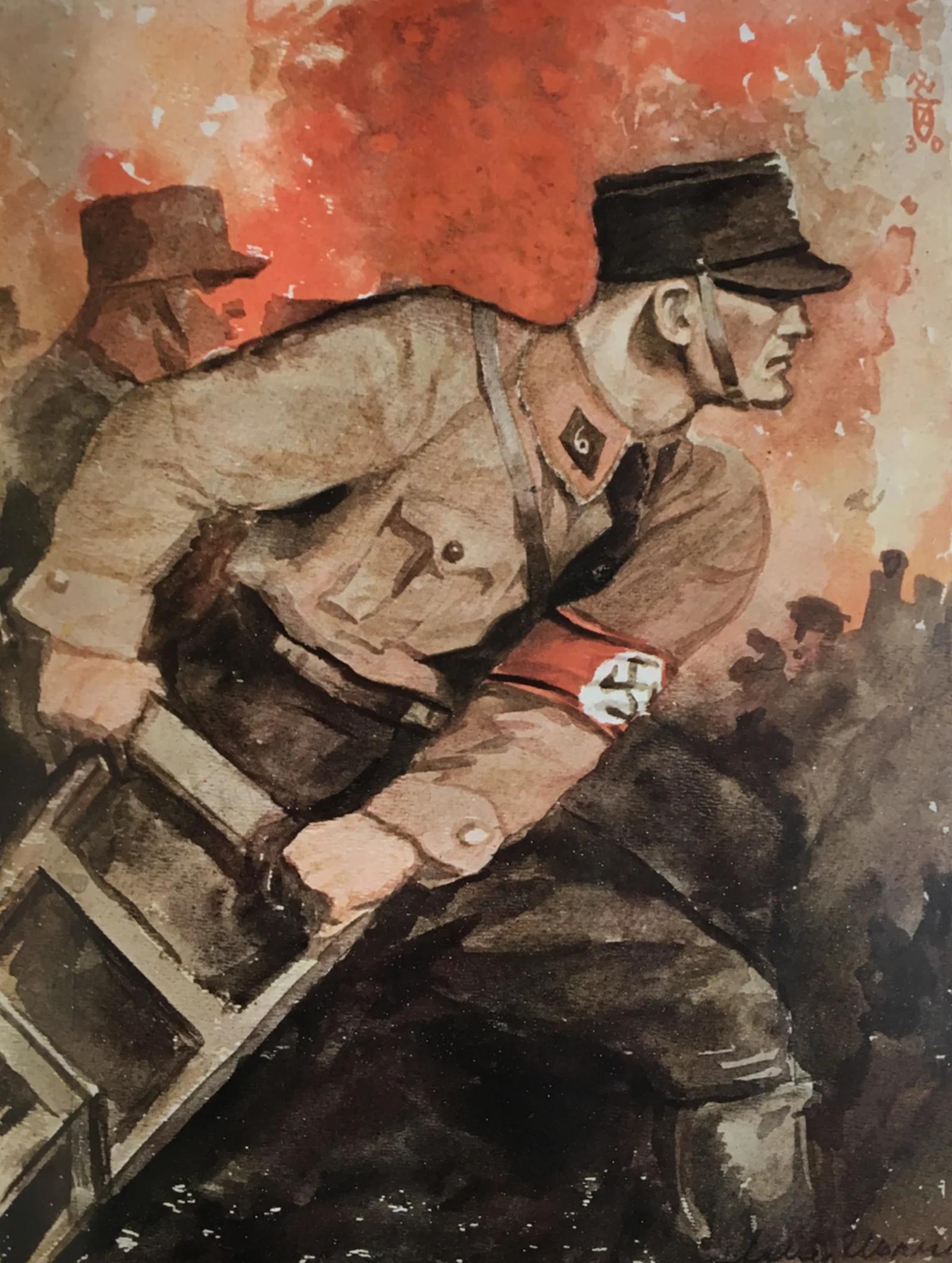 Introduktion: Denne tegning af en ukendt kunstner var en af flere nummererede tegninger, der var placeret som helsidede indstik i Deutschland erwacht. Den ledsagende billedtekst lyder i dansk oversættelse: "Terroren fra venstrefløjen må man imødegå med endnu hårdere midler".