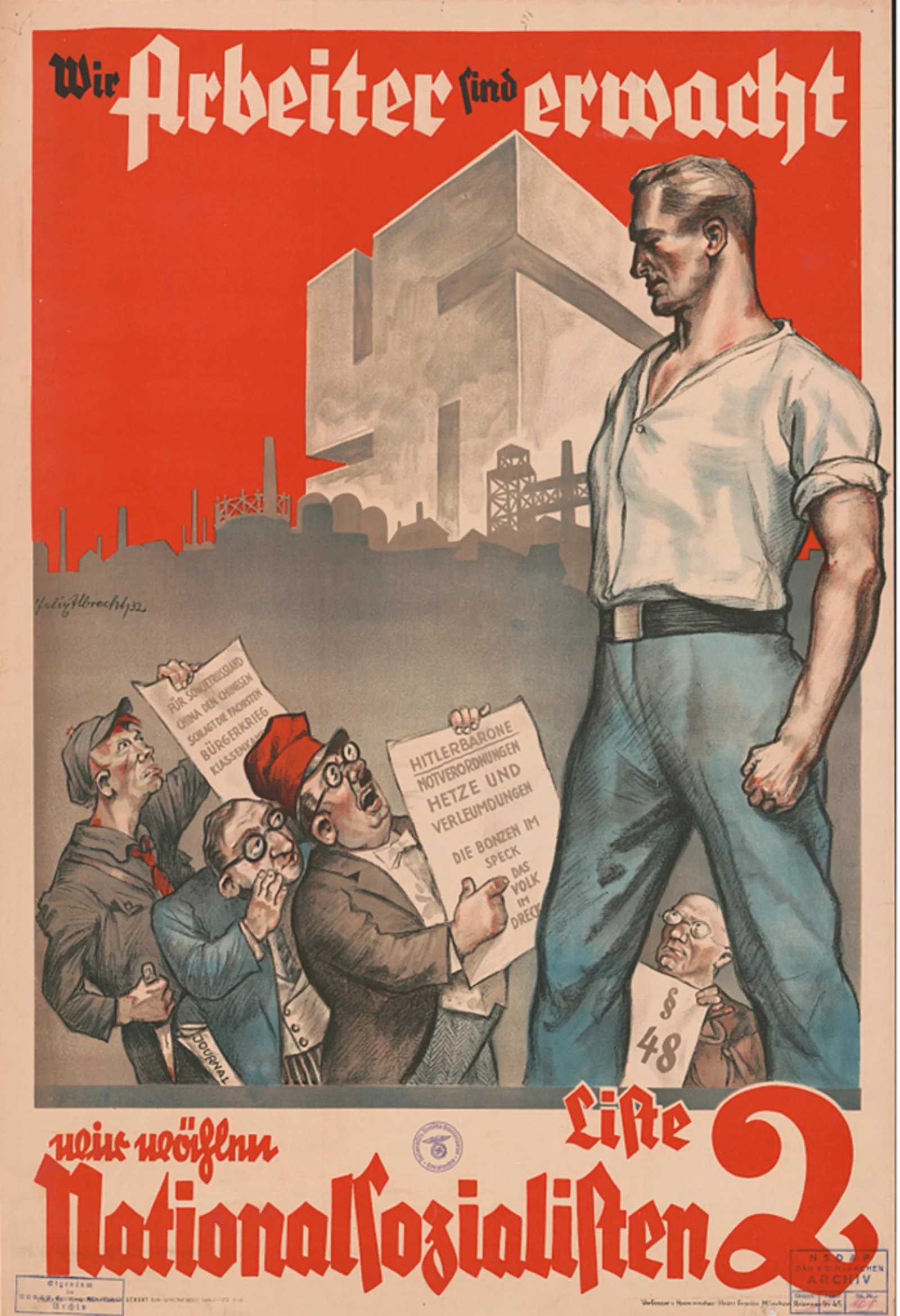 Introduktion: Teksten på plakaten lyder: ”Vi arbejdere er vågnet. Vi vælger nationalsocialister. Liste 2”. På den første af de tre løbesedler, som personerne nederst på plakaten holder, står der: ”For Sovjetrusland, Kina for kinesere, bekæmp fascisterne, borgerkrig, klassekamp”. På den anden står der: ”Hitlerbaroner, nødforordninger, hetz og forulempelser, pamperne til fadet, folket i skidtet”. På den tredje står der: ”§48”. Plakaten blev udformet af Felix Albrecht og måler i original 84 x 120 cm.