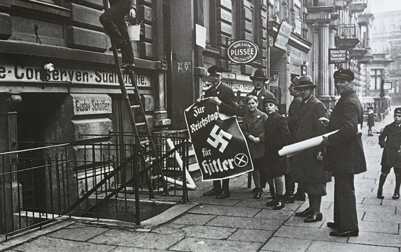Introduktion: Fotografiet er taget af Joseph Schorer (1894-1946), der fra 1922 arbejdede som uafhængig fotograf i Hamborg. Hans hovedarbejdsgiver var lokalavisen Hamburger Tageblatt. På grund af sin negative holdning til det nazistiske styre var Schorer ikke medlem af NSDAP, og i 1936 blev hans kontrakt med Hamburger Tageblatt ophævet. Mange af Schorers fotografier blev ikke offentliggjort i samtiden og befinder sig i dag i forskellige arkiver. I 1986 udkom bogen Als Hamburg unter den Nazis lebte med 152 ikke tidligere offentliggjorte fotografier af Joseph Schorer, heriblandt dette af en gruppe borgere i Hamborg, der er i færd med at hænge en nazistisk valgplakat op i forbindelse med rigsdagsvalget den 5. marts 1933.