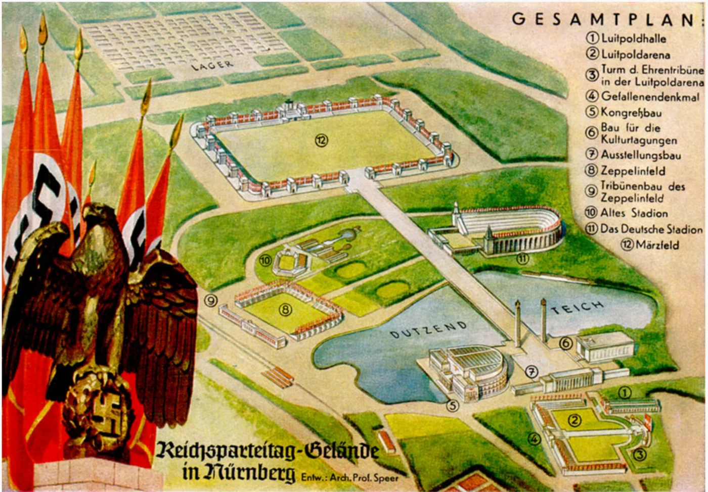 Introduktion: Rigspartidagsområdet i Nürnberg blev udformet efter arkitekten Albert Speers plan. Dette postkort af en ukendt kunstner fra 1938 viser, hvordan området var tænkt i dets helhed. De vigtigste bygningsværker og pladser er markeret med numre. Det var dog kun numrene 1-4 og 8-10, der nåede at blive realiseret før udbruddet af Anden Verdenskrig. Øverst på postkortet ses den store teltlejr ("Lager") for medlemmer af den tyske hær, SS, SA og Hitler-Jugend.