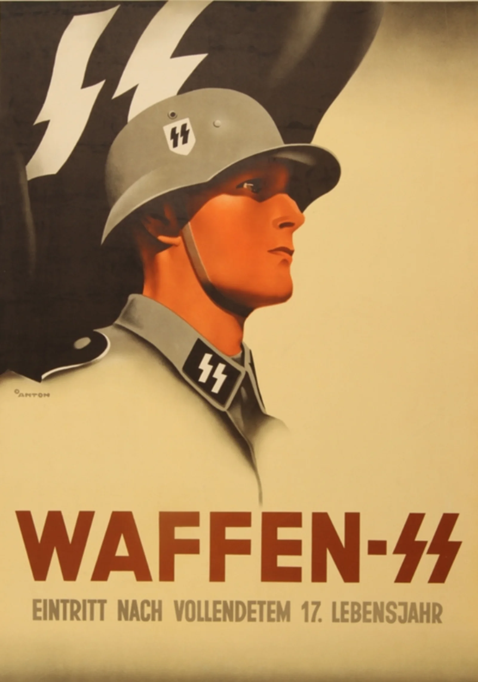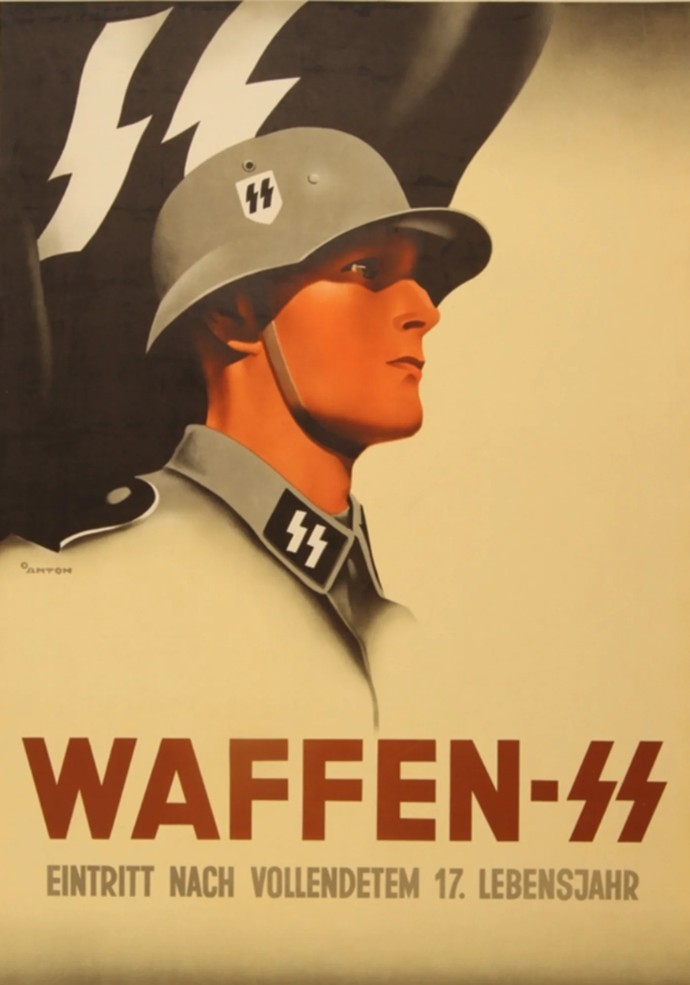 Introduktion: Waffen-SS var fra oktober 1939 betegnelsen for den militære gren af den nazistiske organisation SS. Waffen-SS bestod af frivillige, der havde den rette nazistiske indstilling og en god fysik. I midten af 1944 havde korpset omkring 600.000 medlemmer. På denne hverveplakat fra 1941 oplyses det, at man kan melde sig til Waffen-SS, når man er fyldt 18 år. Plakaten blev fremstillet af den tyske billedkunstner Ottomar Anton (1895-1976). Han meldte sig ind i NSDAP i 1933. I 1936 blev han medlem af SS.