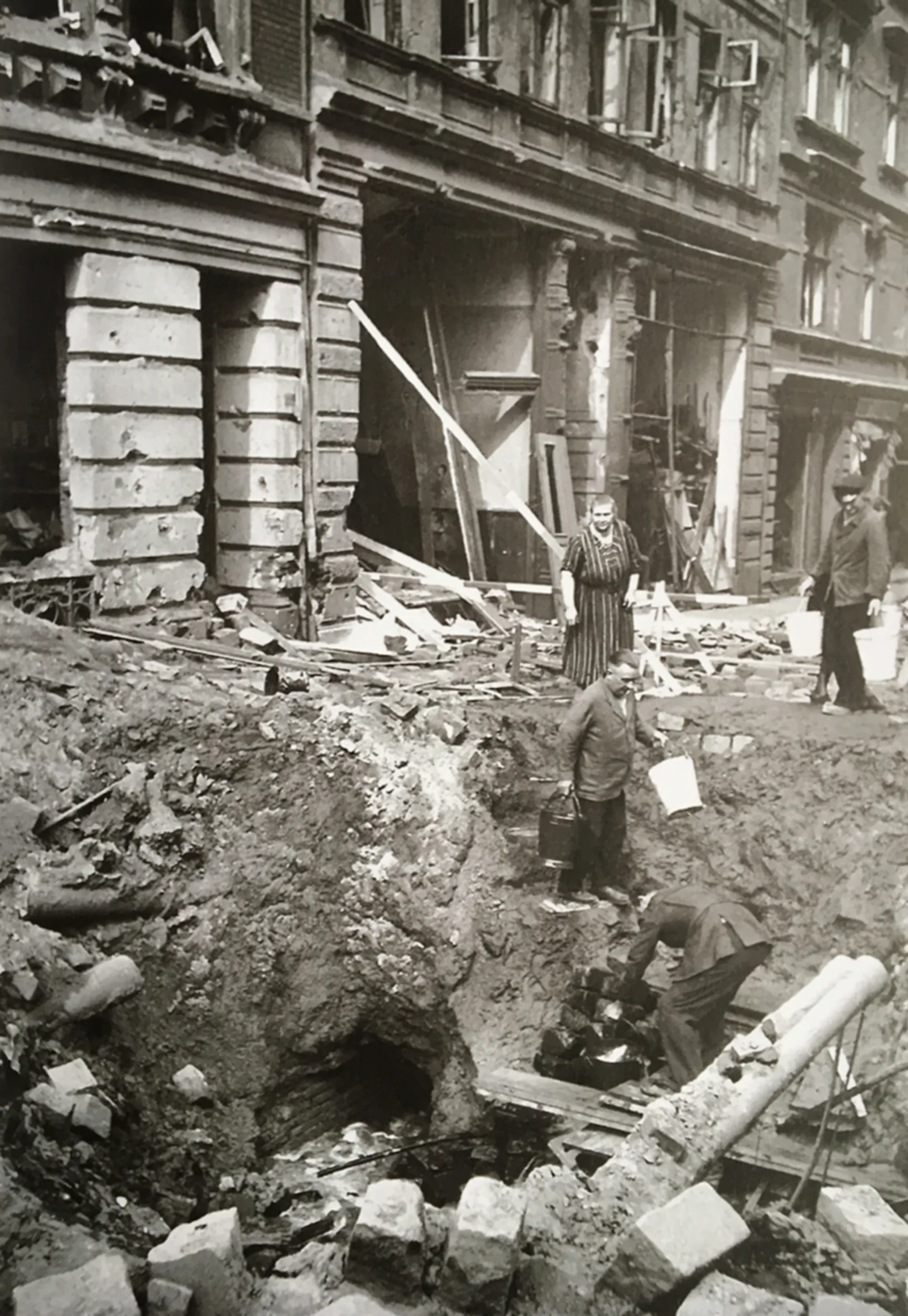 Introduktion: Den 26. juli 1943 tog den tyske fotograf Erich Andres (1905-1992) dette fotografi fra Neustädter Strasse i Hamborg. Det viser lokale beboere, der efter et britisk luftangreb henter vand fra et bristet vandrør. På grund af forbuddet mod at fotografere følgerne af de allieredes luftangreb blev dette og lignende fotografier holdt skjult indtil afslutningen af Anden Verdenskrig. I 2018 udkom fotobogen Tod über Hamburg med mange af Andres´ fotografier.