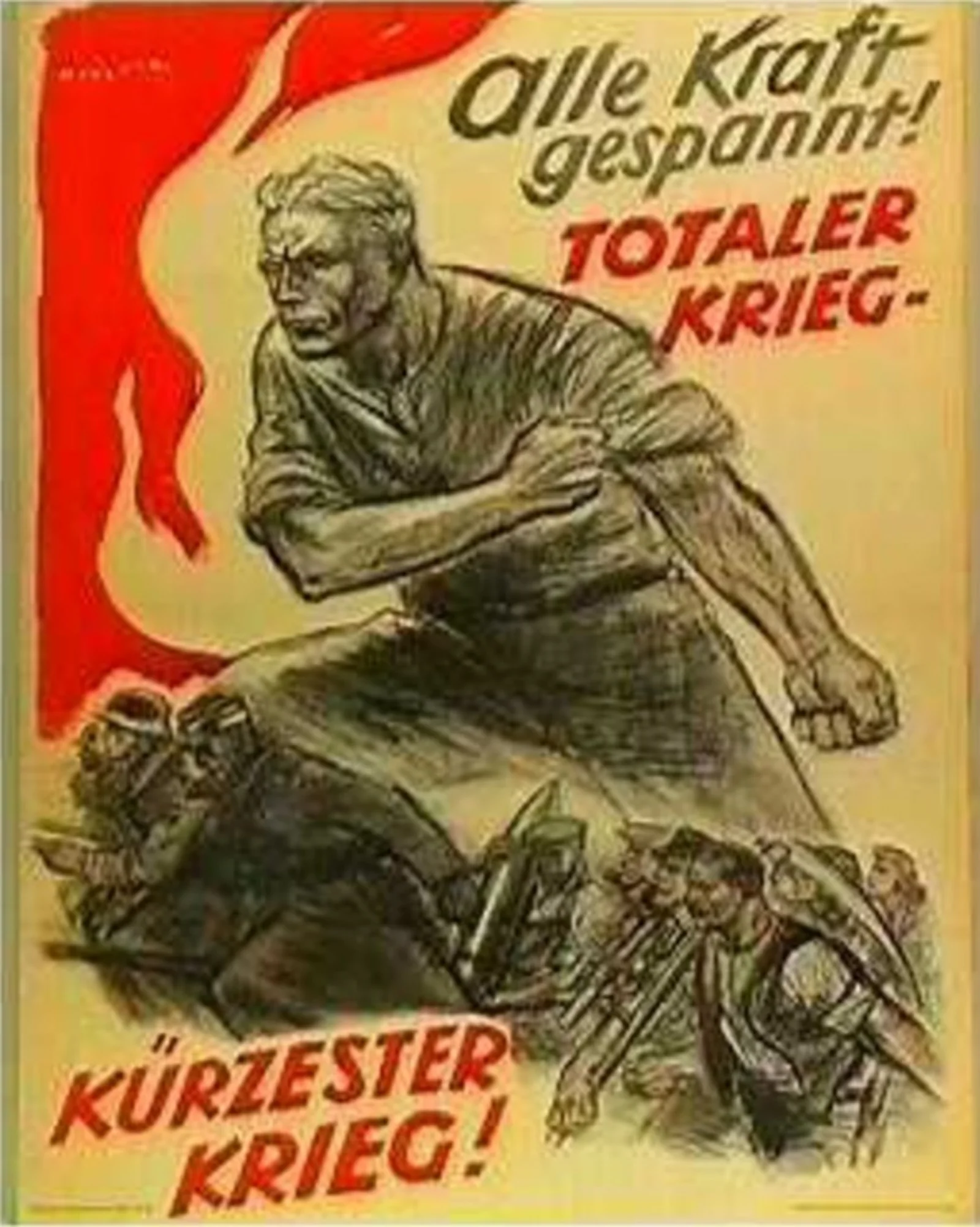 Introduktion: Hans Schweitzer (1901-1980) tegnede i 1943 denne plakat, som i original måler 83,8 x 59,4 cm. Teksten på plakaten lyder: ”Fuld fart frem! Total krig er den korteste krig”.