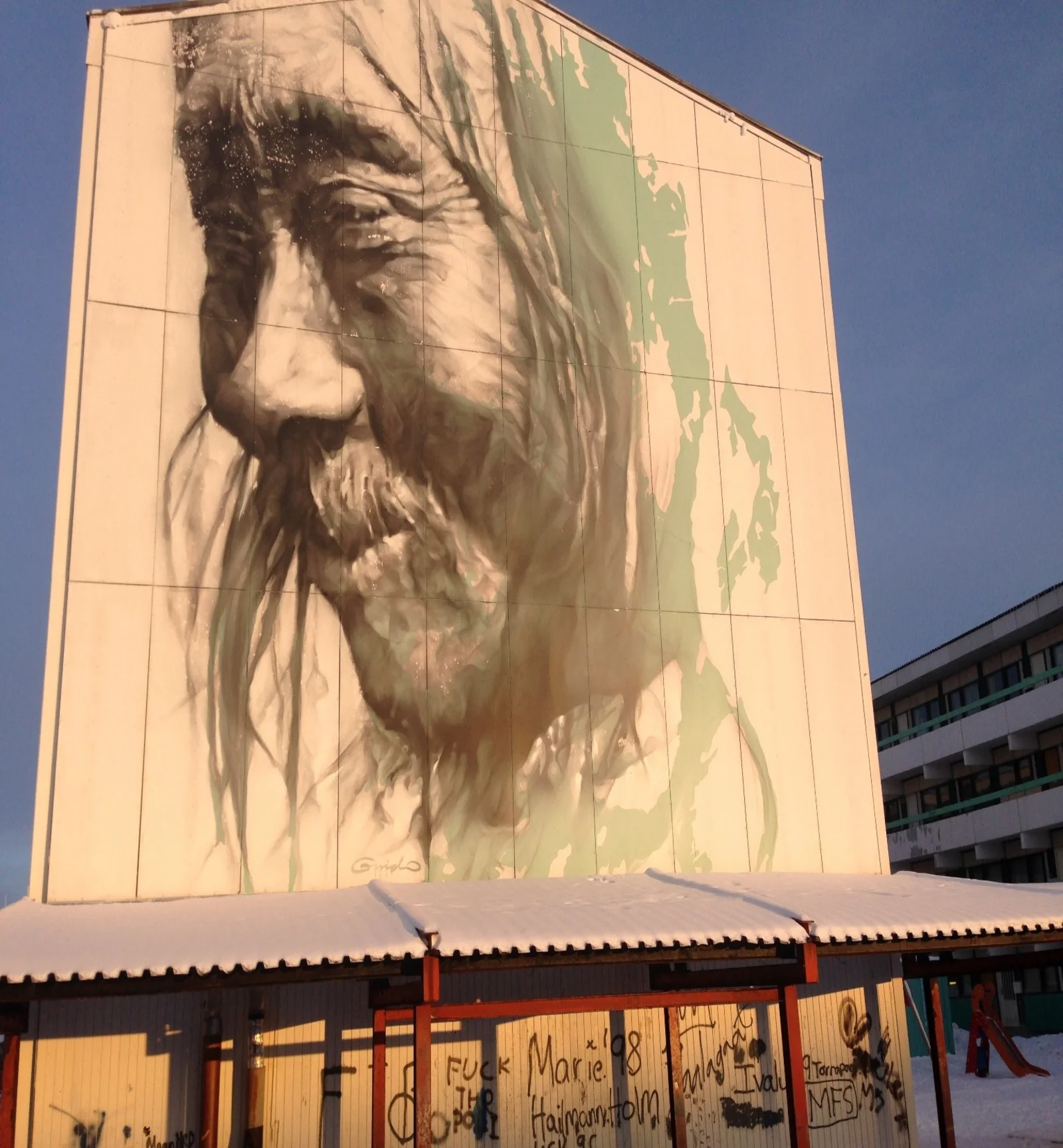 I Nuuk i Grønland finder man dette gavlmaleri fra 2014 (se nedenfor). Maleriet er udfærdiget af den australske kunstner Guido Van Helten. Gavlmaleriet har sit udspring i et fotografi af en person fra Østgrønland. Det er taget i 1906 af forskeren William Thalbitzer, der foretog mange opdagelsesrejser til Grønland.
