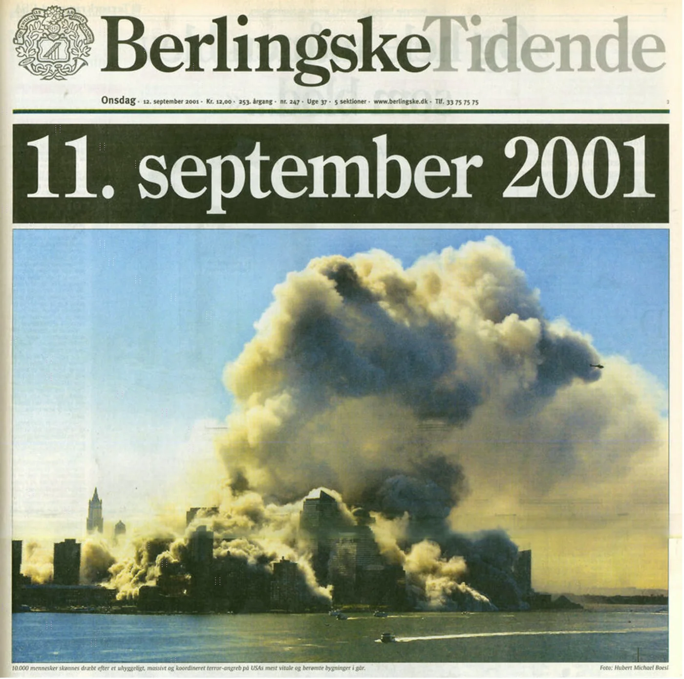 Dette foto blev bragt på Berlingske Tidendes forside den 12. september 2001. Billedteksten lyder: "10.000 mennesker skønnes dræbt efter et uhyggeligt, massivt og koordineret terror-angreb på USAs mest vitale og berømte bygninger i går."