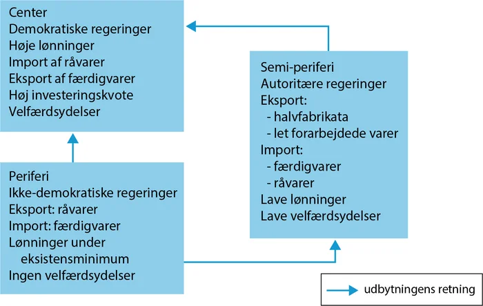 - Sammenlign figur 5.11 med figuren nedenfor (en marxistisk model for udbytning mellem rige og fattige lande). Overvej om de østeuropæiske lande passer ind i kategorien semi-periferi. Inddrag begrebet 'mellemindkomstfælde' (s.74) og læs evt om modellen i "Global politik", 4.udgave, s.114-15.