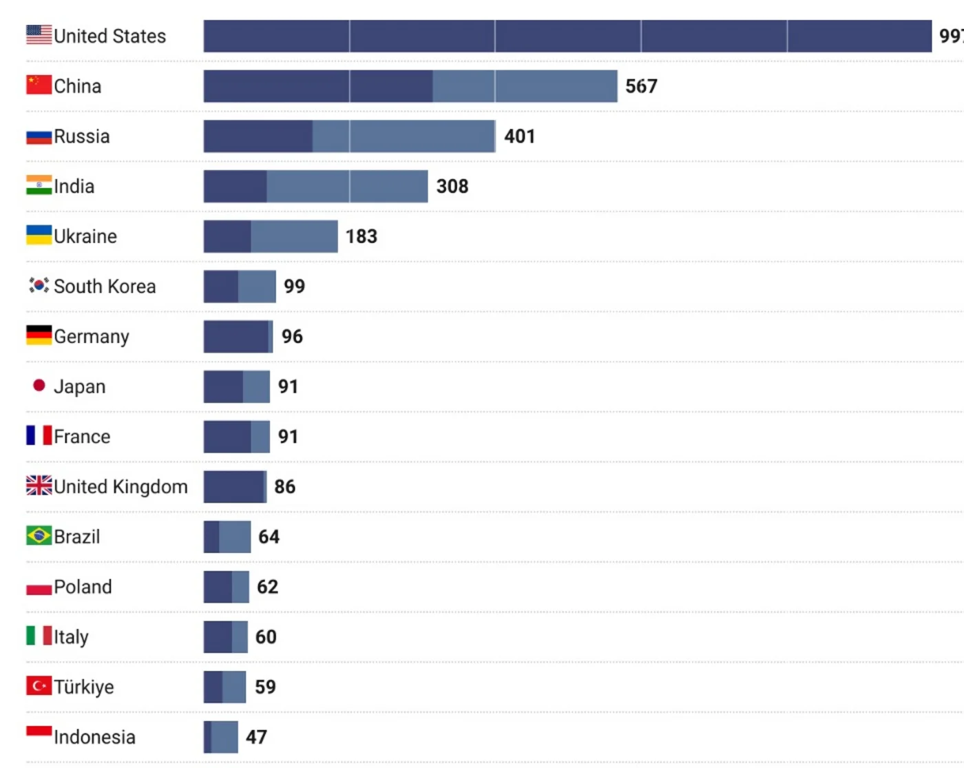 2. Militærudgifter 2024: De 15 lande med det højeste militærbudget. Kilde: SIPRI