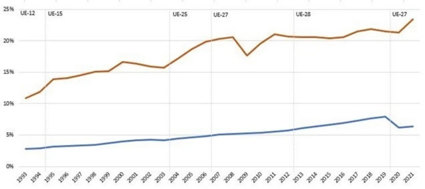 Anmærkning: %-tallene på y-aksen angiver handelen med varer (gul kurve) og tjenesteydelser (blå kurve) som en andel af hele EU’s BNP. De stiplede lodrette linjer angiver ændringen i antal medlemmer inden for EU inden for perioden. Stigningen i %’en for varehandelen efter år 2020 hænger sammen med Storbritanniens udtræden af unionen. (UE = EU)