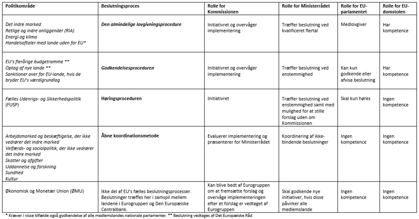 Øvelsen er baseret på bogens figur 1.3.4: EU’s beslutningsprocesser inden for de forskellige politikområder.