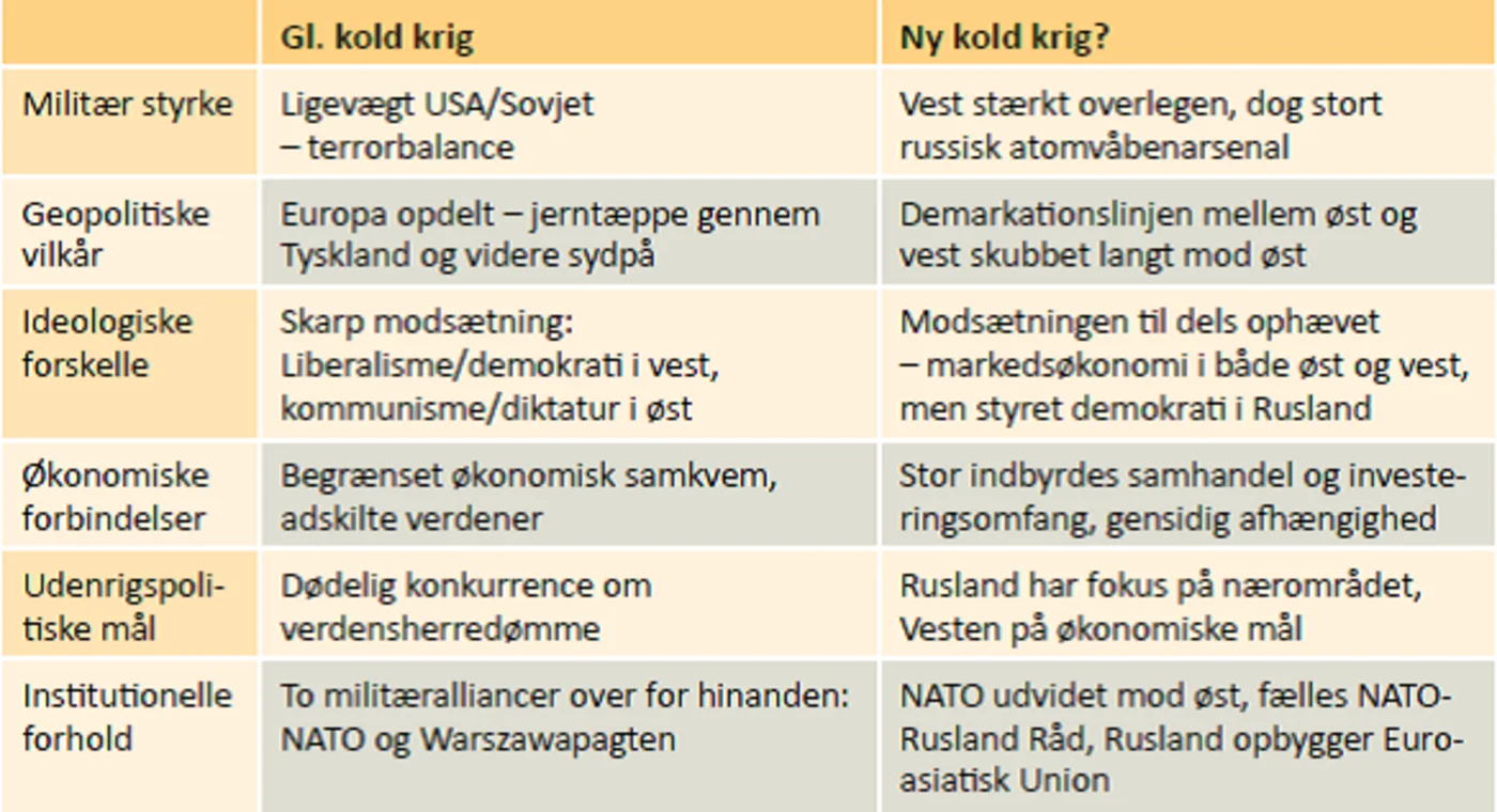 - Nedenfor er gengivet et skema om forskellen mellem den gamle og den nye kolde krig (jf. "Kloden Rundt", Columbus 2014, s. 94). Brug skemaet til at forklare hvorfor vore dages Rusland repræsenterer en anden type trussel end den tidligere Sovjetunion gjorde? Inddrag sektoropdelingen i i fig. 3.9.