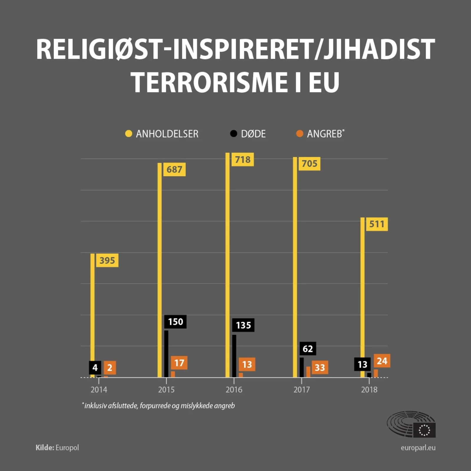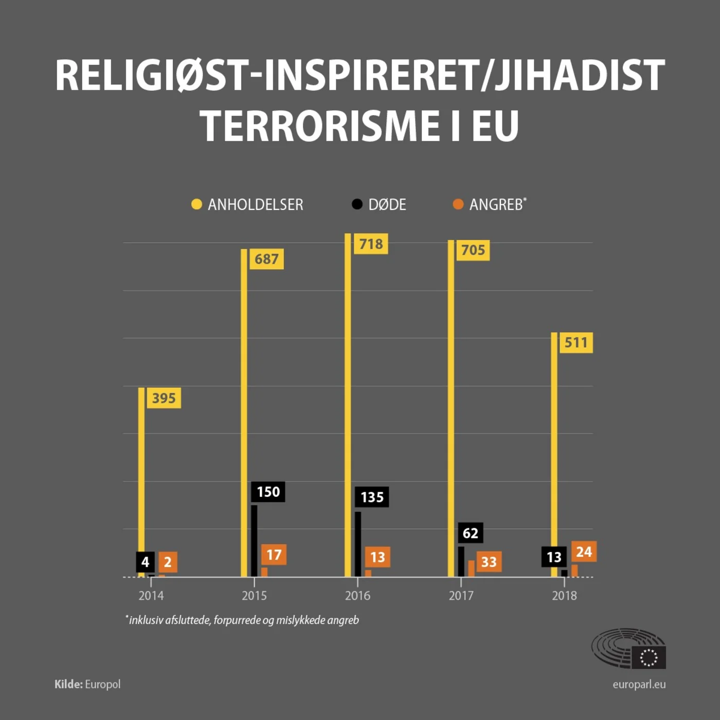 - Giv en overordnet redegørelse for hvordan terrorismen i Europa og i verden har udviklet sig i de seneste år. Tag udgangspunkt i figuren ovenfor (opgaven om hovedtrusler s.70) og i dagbladet Informations lederartikel 16.3.2019: "Islamisk terrorisme er på retur, mens en højreradikal hvis terrorisme viser sig" (brug Infomedia).