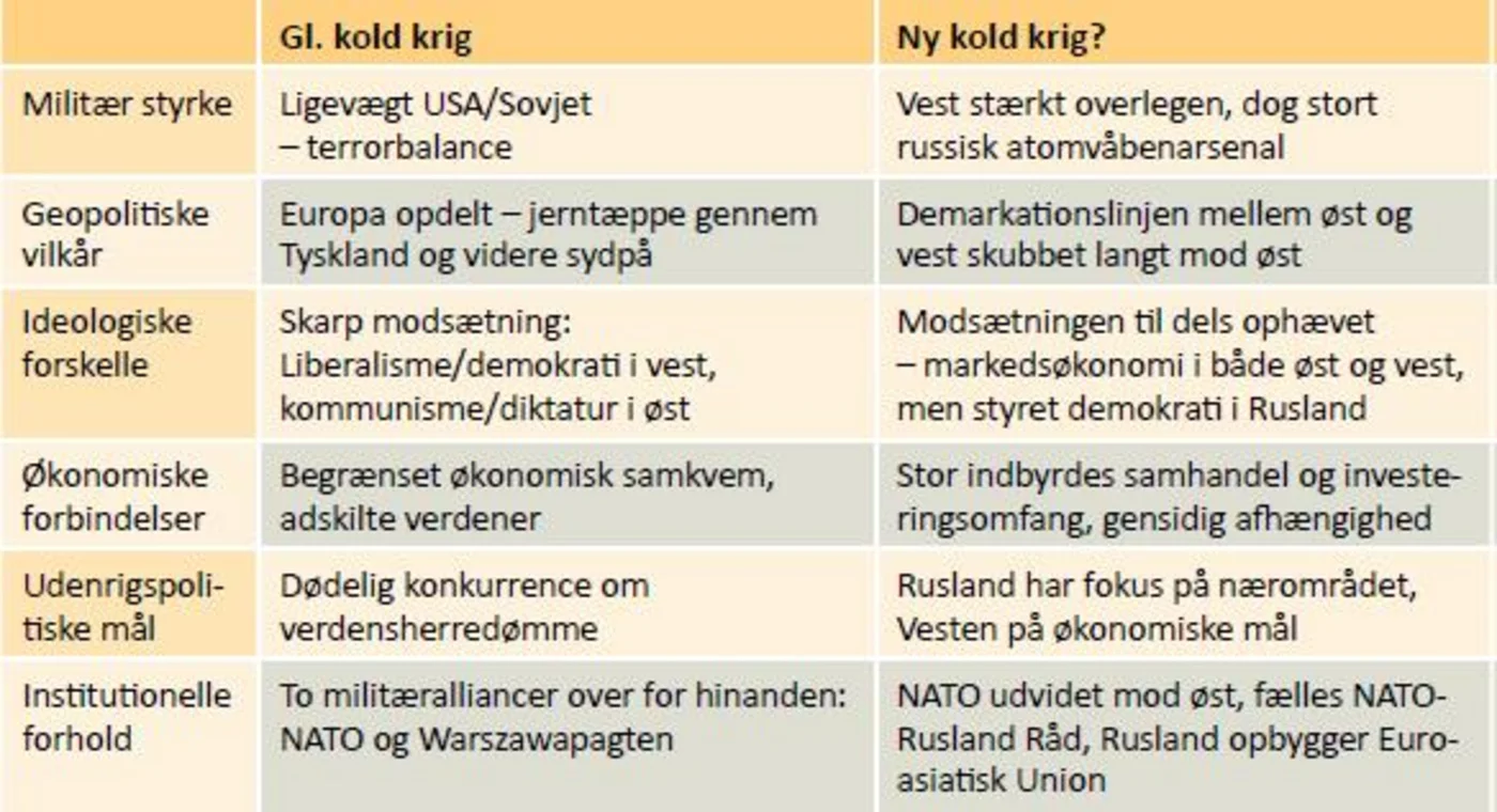 - Nedenfor er gengivet et skema om forskellen mellem den gamle og den nye kolde krig (jf. "Kloden Rundt", Columbus 2014, s.94). Brug skemaet til at forklare hvorfor vore dages Rusland repræsenterer en anden type trussel end den tidligere Sovjetunion gjorde? Inddrag sektoropdelingen i i fig. 3.8 og nuancér besvarelsen ved at inddrage boksen s.156.