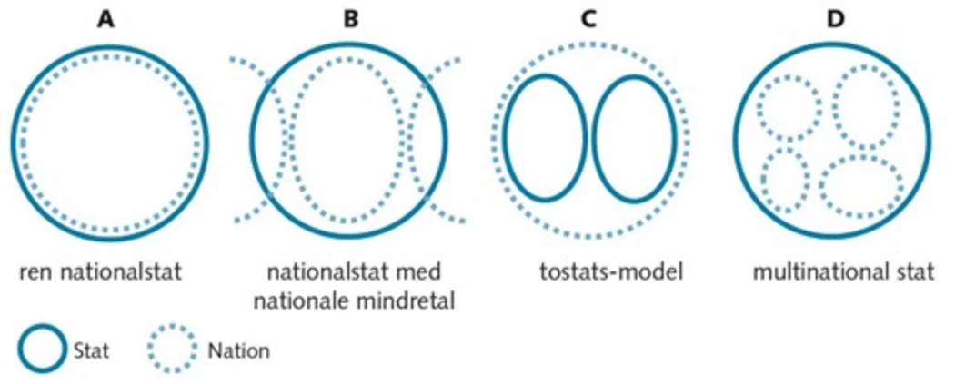 - Forklar forskellen på begreberne ”stat” og ”nation”. Skriv stikord i et skema som nedenstående og inddrag figuren nedenfor.
