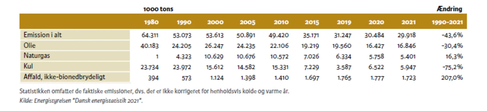 - I tabel C, til højre, kan du se, hvordan CO2-udledningen fra Danmarks energiforbrug har været i perioden 1980-2021. Tabellen viser både den samlede CO2-udledning og udledningen fordelt på brændselstyper.