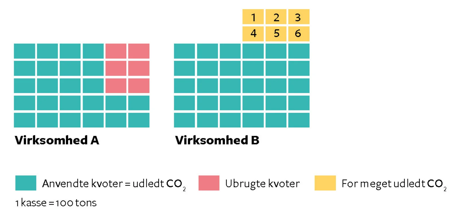 I figur A til højre har vi opstillet et eksempel på kvotesystemets virkninger. Vi har valgt en pris på 600 kr. pr. kvote (altså 60.000 kr. for 100 kvoter). Virksomhed A i figuren når slet ikke op på den CO2-udledning, som den har kvoter til, og den er derfor interesseret i at sælge sine 600 overskydende kvoter. Virksomhed B derimod udleder 600 tons for meget CO2 (6 kasser af 100 tons). Den skal nu vælge, om den skal nedbringe udledningen ved at forbedre sin teknologi, eller om den skal købe kvoter på markedet. Omkostningerne ved at forbedre teknologien stiger gradvist for hver kasse af 100 tons for meget udledt CO2. Du kan se omkostningernes udvikling i tabelen nedenfor.