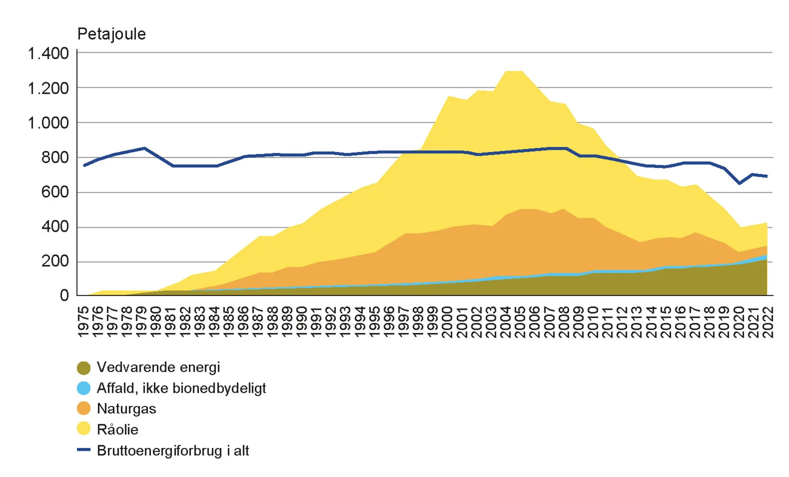 - I figur A til højre kan du se, hvordan Danmarks produktion af primær energi og forbrug af energi har udviklet sig siden 1975.