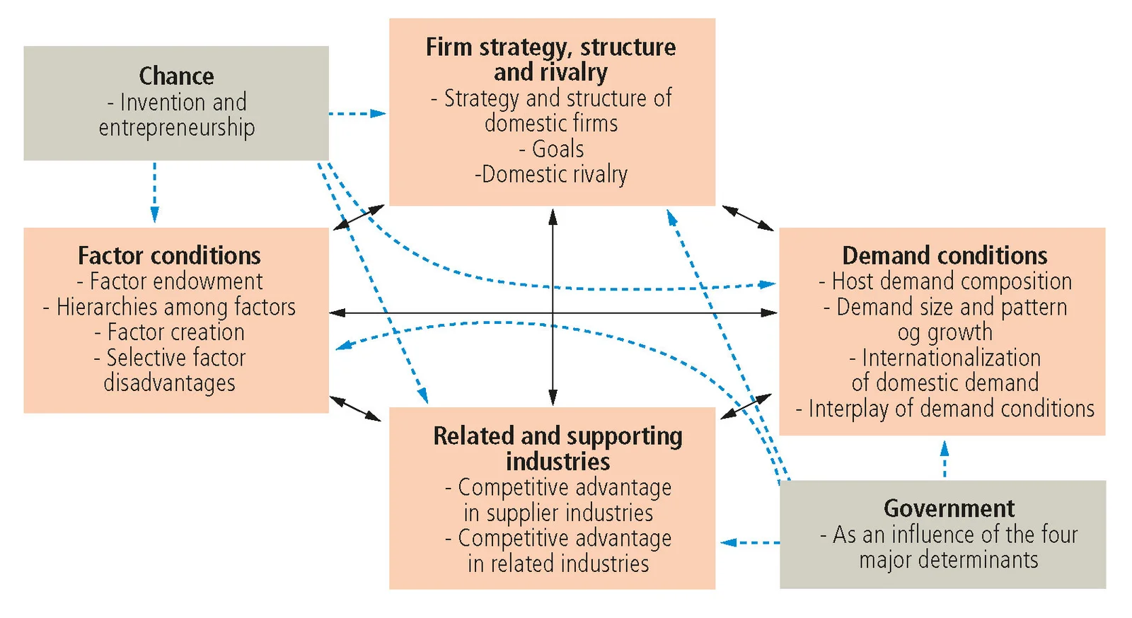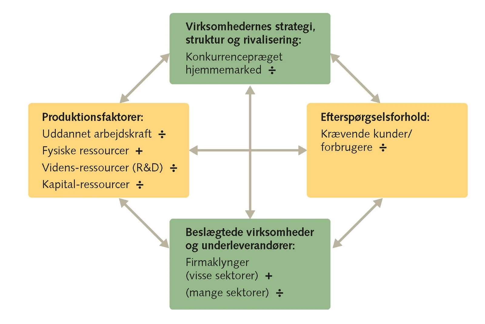 - Michael Porters diamant fra 1990 er en model, der har til formål at vise, hvorfor et land eller en region står stærkt (eller det modsatte) i den internationale konkurrence. Du kan se modellen til højre. Sammenlign de faktorer, Porter har med i sin model, med de faktorer der indgår i World Competitiveness Index.