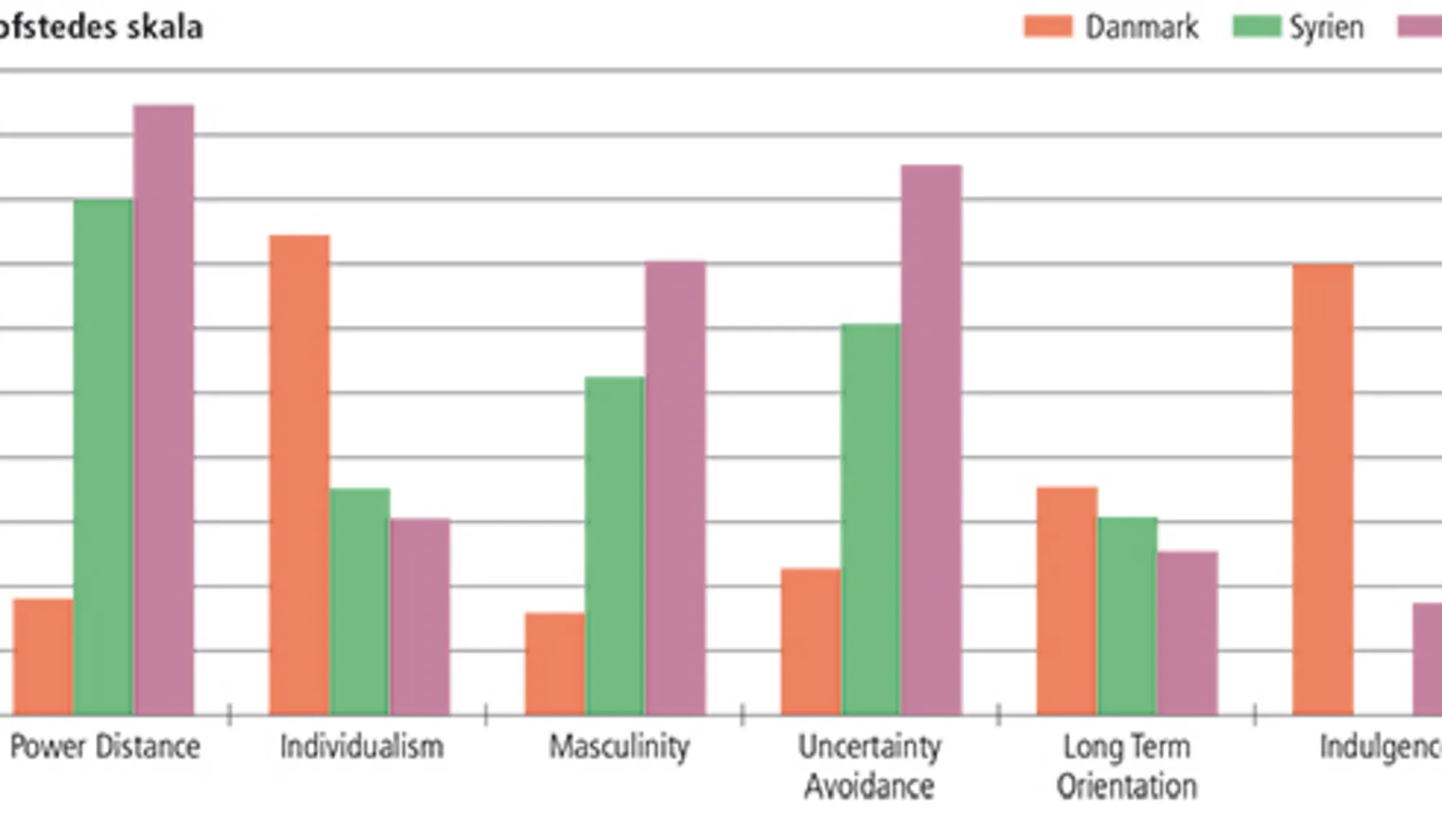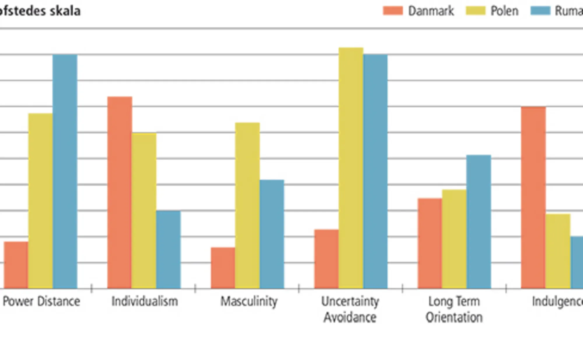 - 4.4b Sammenligning af Hofstedes seks dimensioner mellem Danmark, Syrien, Irak, Polen og Rumænien