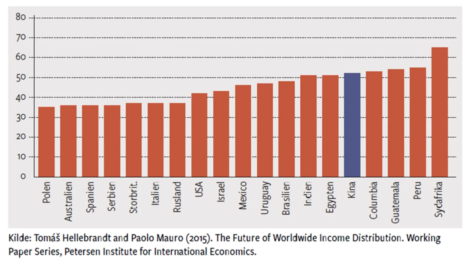 - Hvor står Kina sammenlignet med andre lande, når det kommer til ulighed (udtrykt vha. gini-koefficienten)?