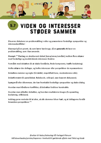 Eleverne skal opdage, at naturfaglig viden bruges forskelligt, alt efter hvilke interesser der er på spil. I øvelsen diskuterer eleverne en problemstilling i roller og præsenterer forskellige synspunkter og interessekonflikter.