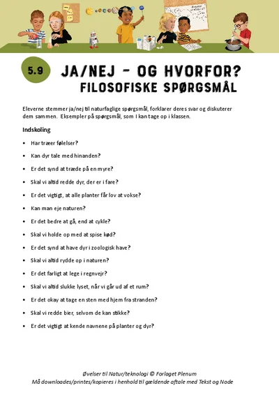 Formålet med øvelsen er at fremme undren og styrke elevernes evne til at tage stilling, begrunde deres holdninger og tænke kritisk over naturfaglige og etiske spørgsmål. På kopiarket er der forslag til naturfaglige spørgsmål, som eleverne kan stemme ja/nej til.
