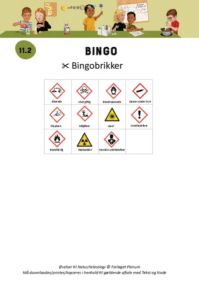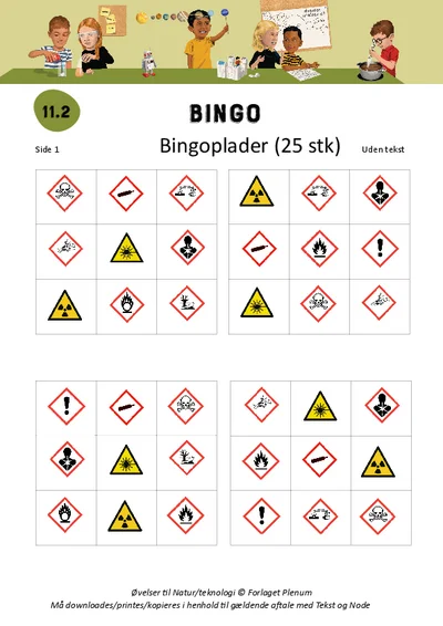 Download 25 bingoplader til faresymbol-bingo. I pdf-filen findes både bingo-plader med og uden tekst. Dem uden tekst er naturligvis sværere at anvende, da det kræver at eleverne kan huske, hvad de enkelte symboler betyder.