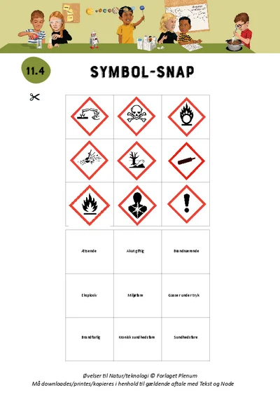 Lav to sæt kort: ét sæt med faresymboler (fx brandfarlig, giftig, sundhedsskadelig, miljøfarlig osv.) og ét sæt med korte forklaringer på betydningen af hvert symbol. Sørg for, at kortene passer sammen én-til-én. Kortene kan være printet eller lamineret, så de kan genbruges. Del eleverne op i par eller små grupper.