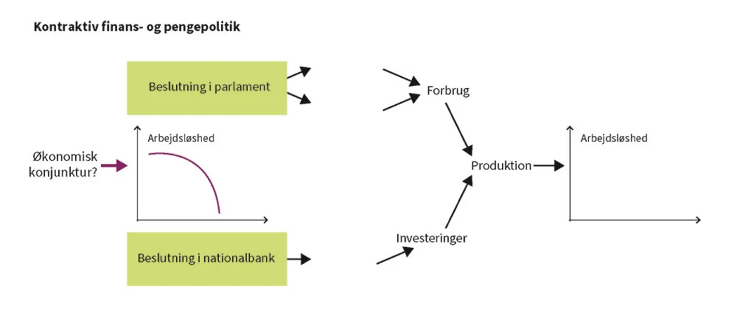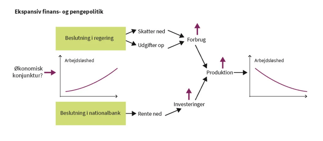 Klassen deles i par. A laver fysisk aktivitet, eks gang/løb/sprællemand/armbøjninger etc. på stedet i et jævnt tempo. B ”skruer op og ned” for A´s aktivitet ved at bruge hhv. ekspansiv og kontraktiv pengepolitik. Hvis B siger ”renten sættes op til 3% - så skal A øge niveauet og tilsvarende skal A dæmpe aktiviteten hvis B siger ”den kvantitative lettelse stoppes”. Der byttes mellem parrene undervejs.