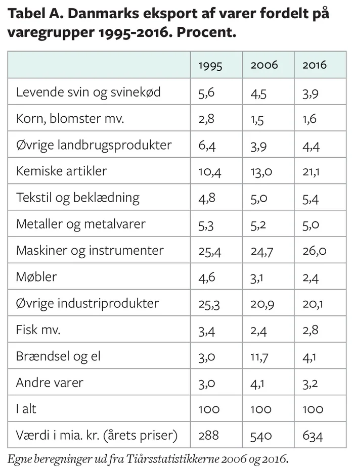 I tabel A kan du se, hvordan Danmarks vareeksport har været sammensat i 1995, 2006 og 2016.