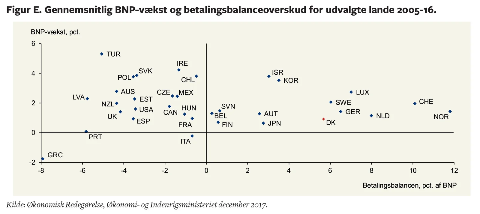 I nedenstående figur A viser vi for en række forskellige lande den gennemsnitlige økonomiske vækst (i faste priser) og det gennemsnitlige årlige overskud på betalingsbalancen i perioden 2005-16.