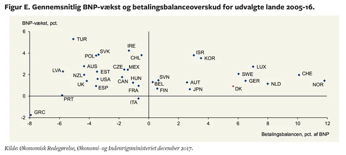 - Kan du overhovedet ud fra figuren udlede en sammenhæng mellem økonomisk vækst og betalingsbalanceoverskud?