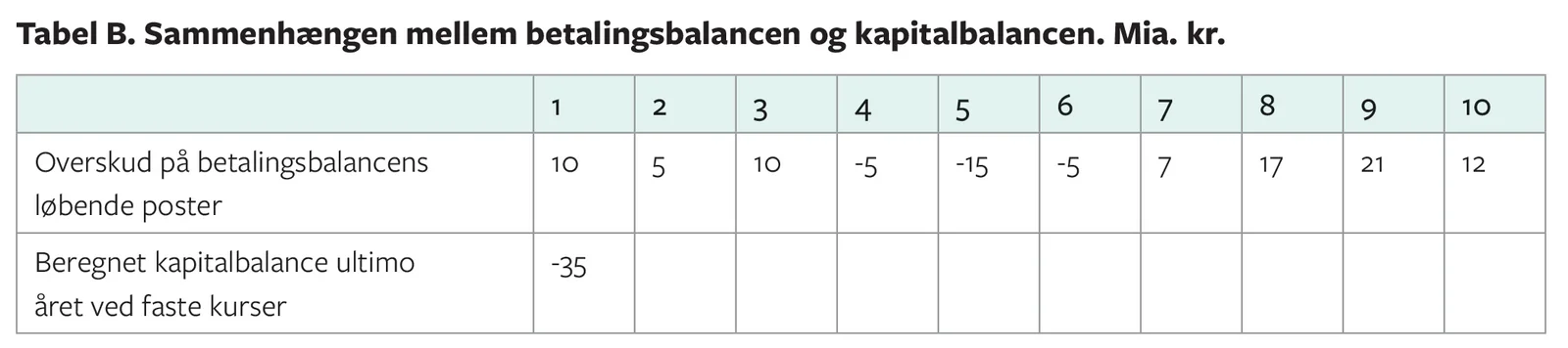 I tabel B har vi lavet et konstrueret eksempel for udviklingen i et lands betalingsbalance. Vi forudsætter i eksemplet, at valutakurserne over for alle andre lande og alle aktiekurser er konstante over hele perioden.