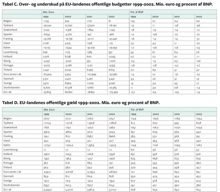 I tabellerne B og C nedenfor kan du se, hvordan det i de 15 EU-lande i perioden 1999-2002 stod til med to af konvergenskravene: