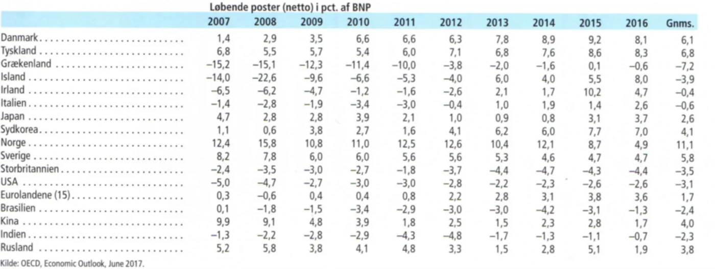 - I tabel A kan du se, hvordan betalingsbalancens løbende poster i procent af BNP har udviklet sig i perioden 2007-2016 i en række udvalgte lande.
