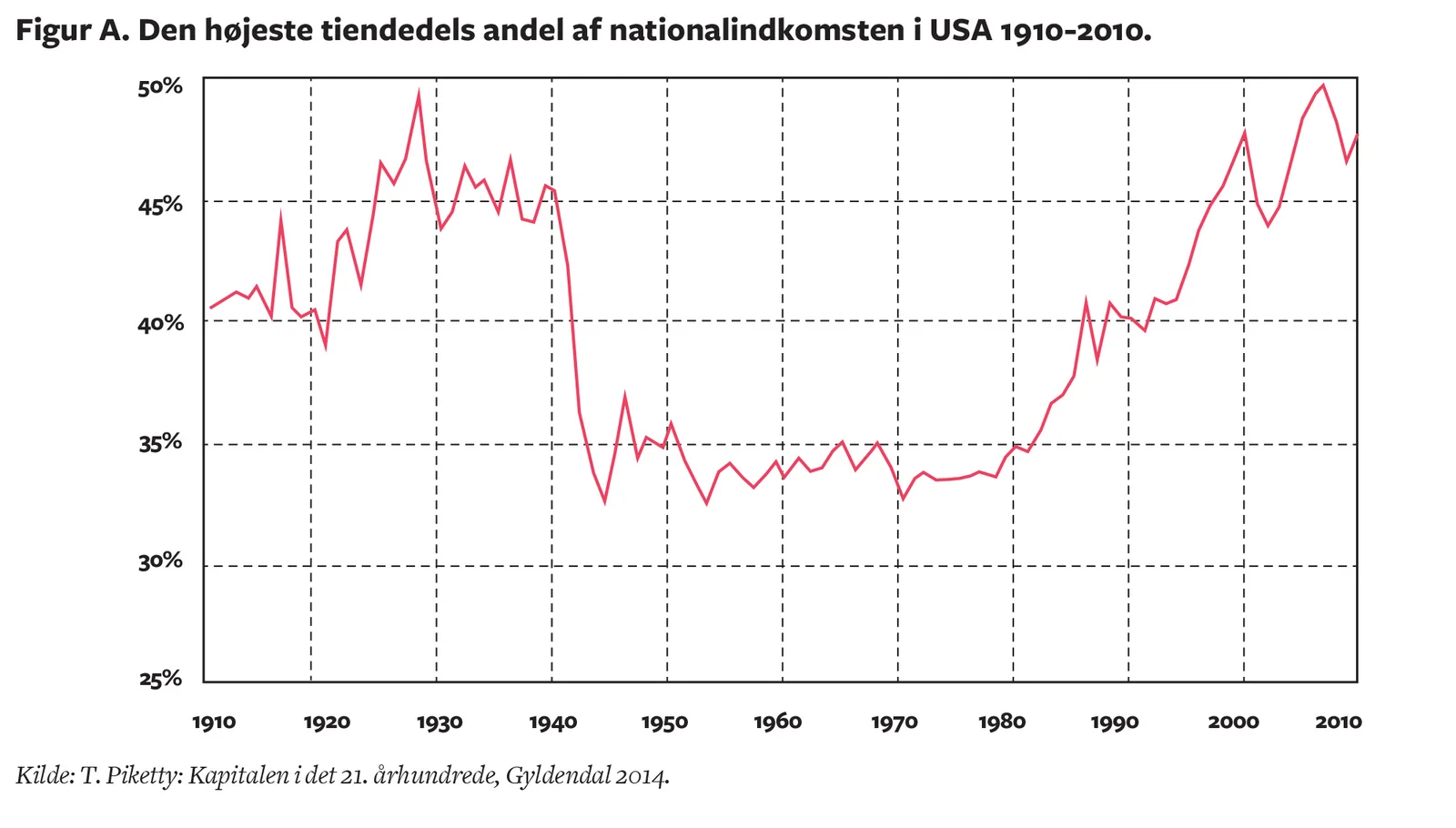 - Hvis der skulle være fuldstændig indkomstlighed i USA, skulle alle tiendedele af befolkningen naturligvis hver have 10 % af nationalindkomsten. Men sådan har det aldrig været. Forklar ud fra figuren, hvordan 1. verdenskrig, 2. verdenskrig og den globale liberalisering har påvirket indkomstuligheden. Overvej årsagerne til disse påvirkninger.