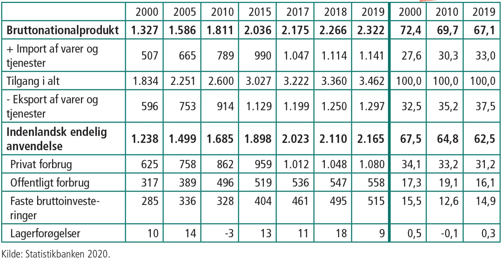Du kan sikkert huske, at vi i tabel 3.1 (se nederst i opgaven), tilbage i kapitel 3 viste, hvordan tilgangen og anvendelsen af varer og tjenester (forsyningsbalancen) udviklede sig fra 2000-2019.