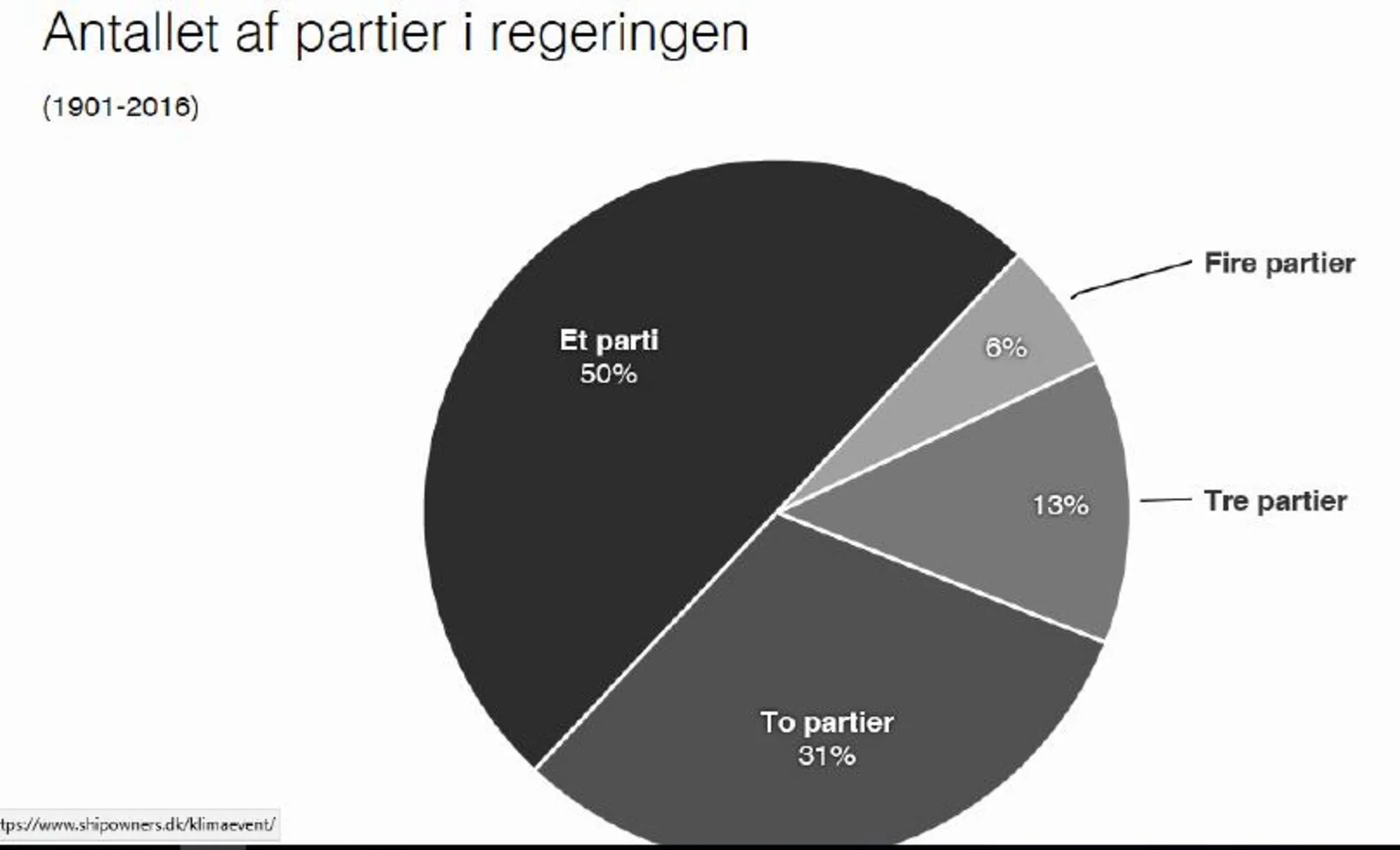 - Undersøg, hvad der af nedenstående lagkagediagram kan udledes om regeringerne i Danmark. Prøv at koble dette til din viden om negativ parlamentarisme.