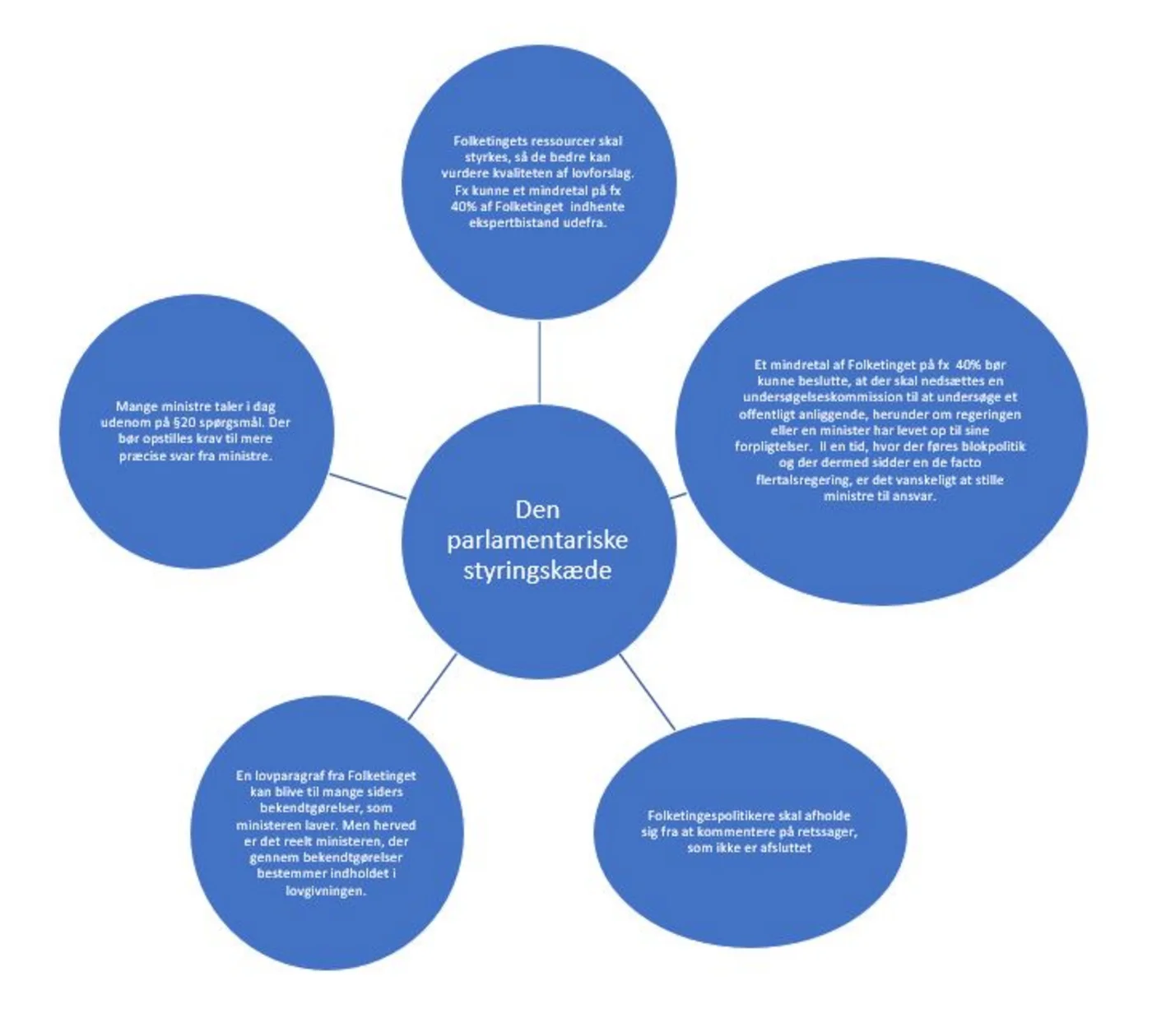 - Undersøg hvorvidt folketingspolitikeren Aage Frandsens forslag til at forbedre den parlamentariske styringskædes virkemåde er en god ide. Diskuter fordele og ulemper ved forslagene og om tiltagene er mulige at gennemføre. Forslagene er illustreret i nedenstående figur.