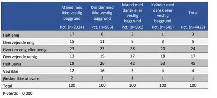 - a) Undersøg om der er forskel mellem de forskellige gruppers holdninger til mænds magt i det danske samfund. Se figur 2 herunder.