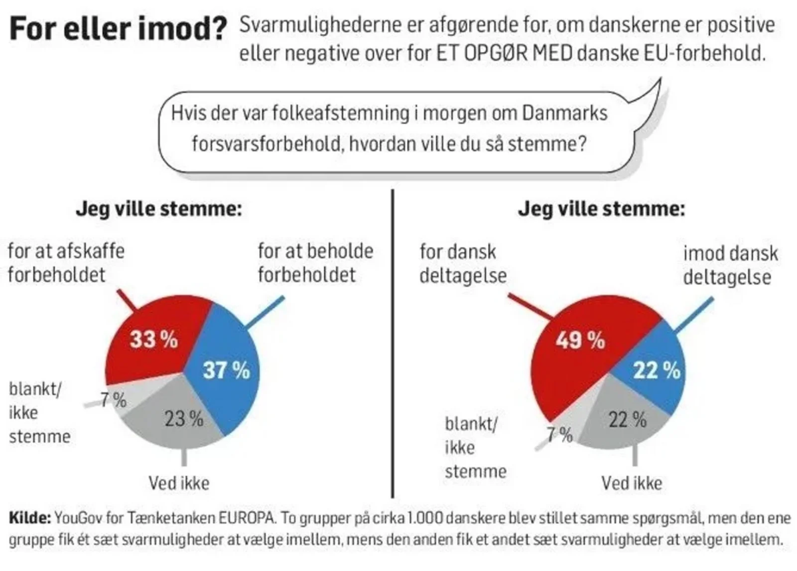 - I artiklen ”EU-forbehold. Opbakning afhænger af svarmulighederne” fra Politiken den 3. februar 2019 refereres en undersøgelse, hvor man har givet to forskellige grupper på hver 1000 respondenter to forskellige sæt svarmuligheder vedrørende de danske EU-forbehold. Svarene er gengivet i figur 1 i bunden af boksen.
